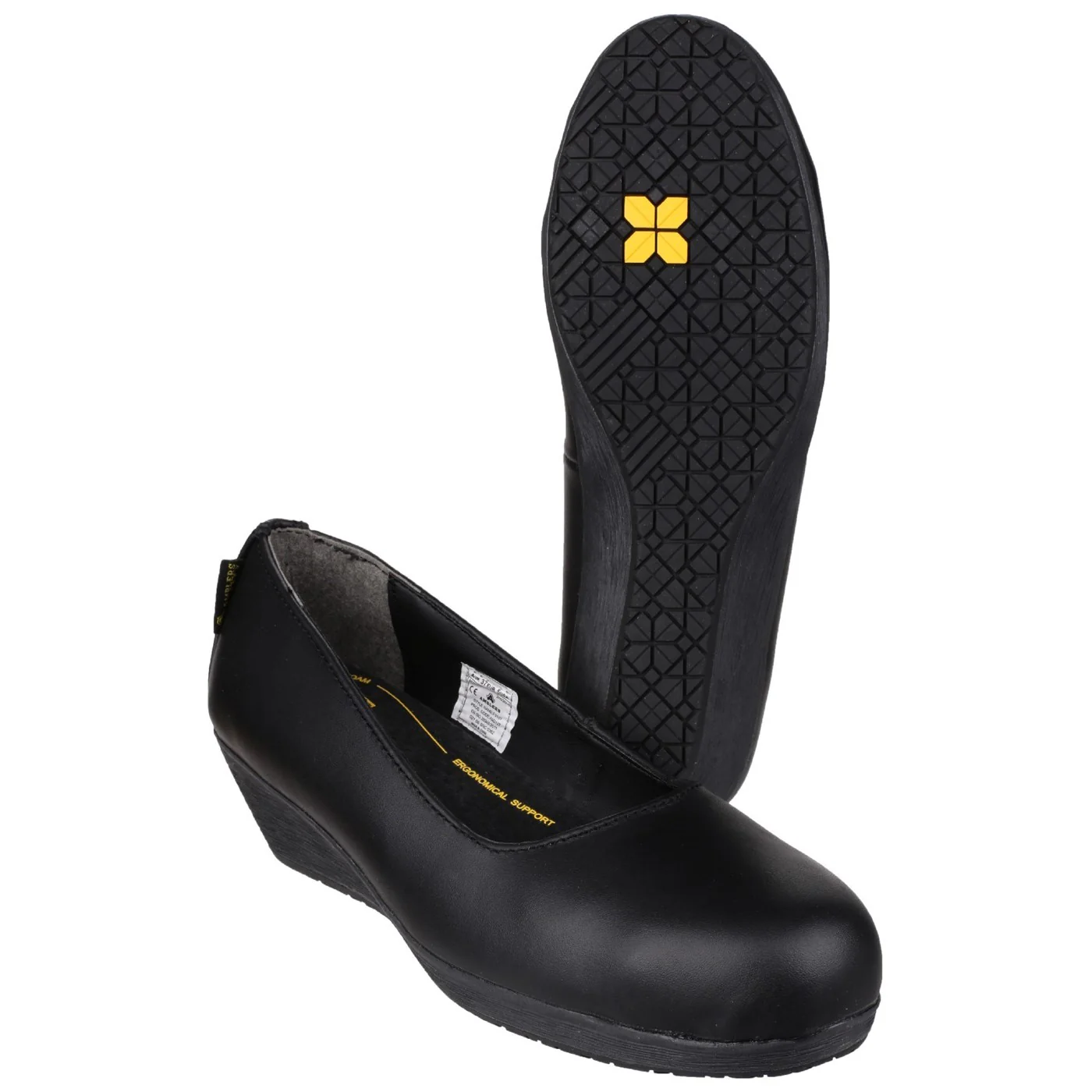 A stylish leather ladies wedge shoe with steel toe cap and excellent anti-slip SRC sole. 200J toe protection.